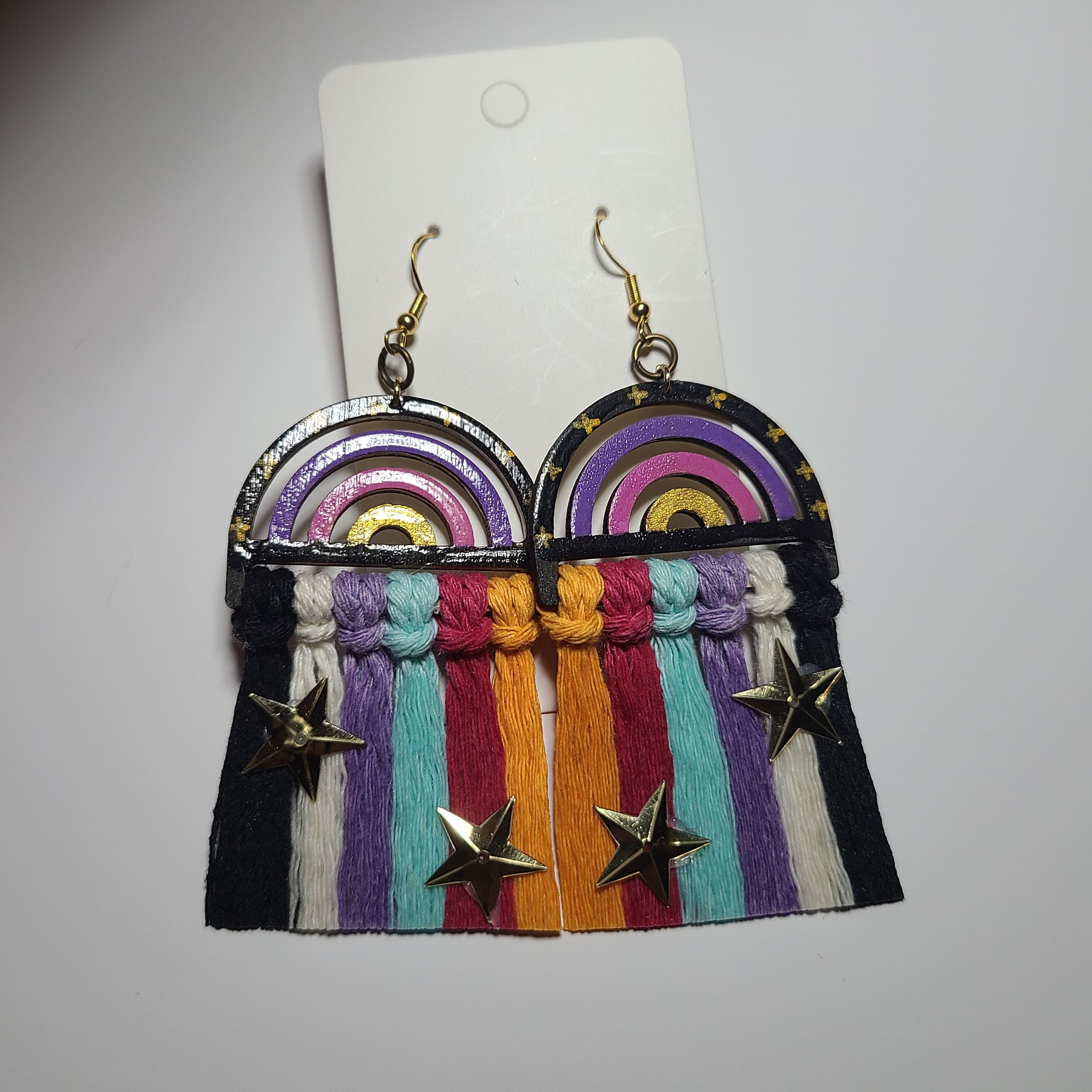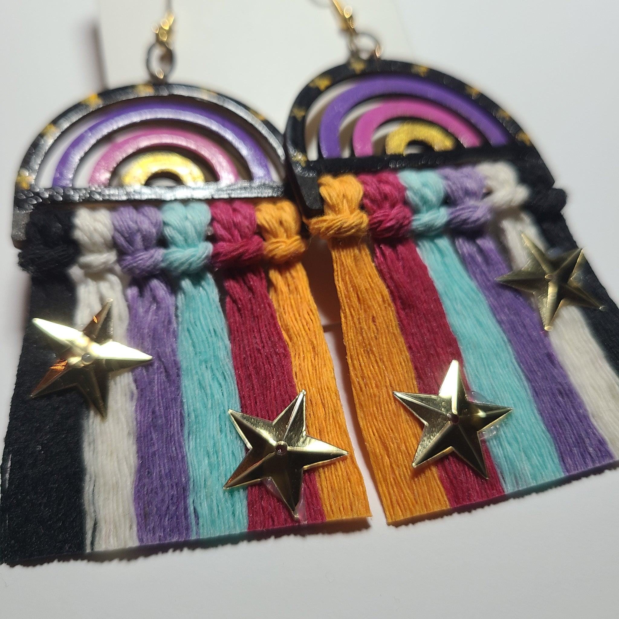 Earrings created with wood frames, yarn, with hints of gold painted and 3D stars
